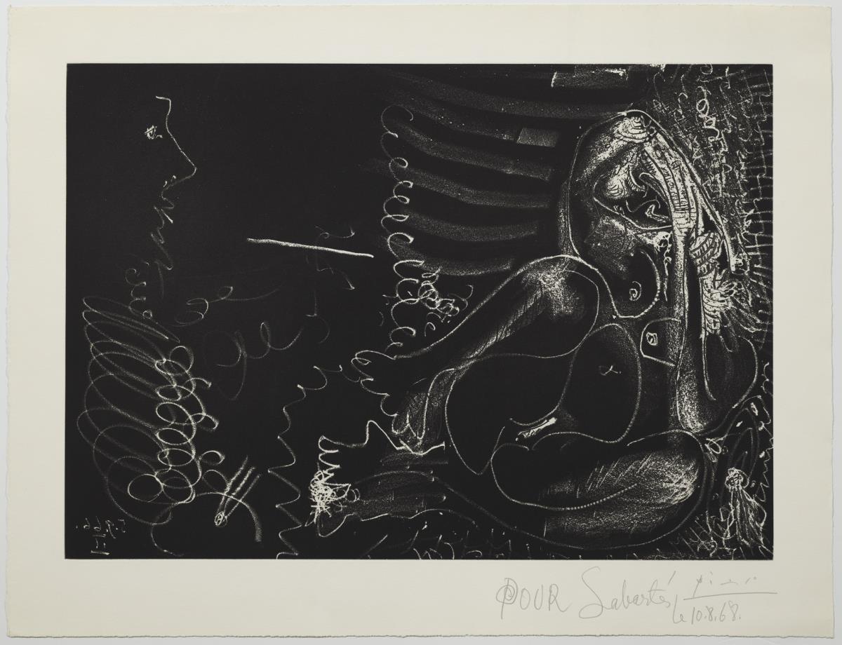 Aguatinta (reservas al lápiz litográfico en el graneado) y aguafuerte sobre cobre; estampado sobre papel vitela Rives (prueba Sabartés)