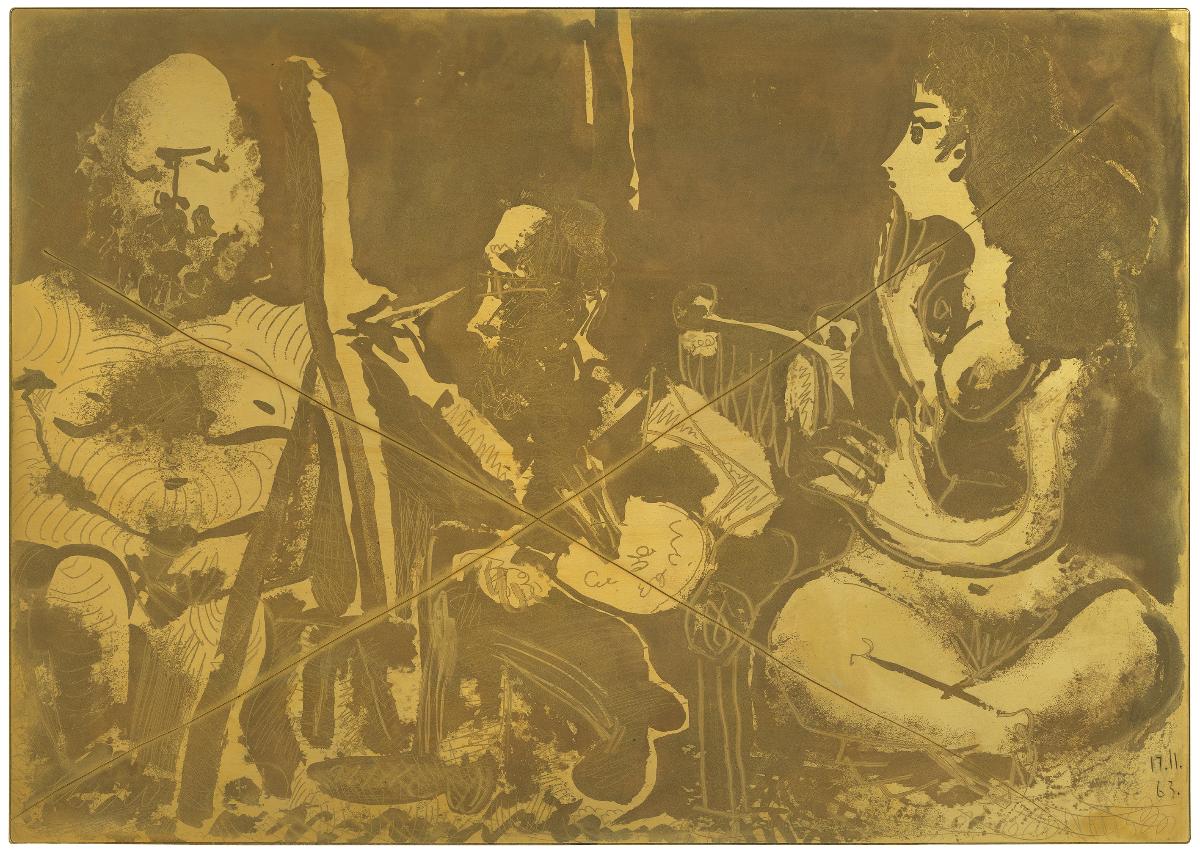 Plancha de cobre anulada de aguatinta al azúcar con mordida a mano y aguafuerte