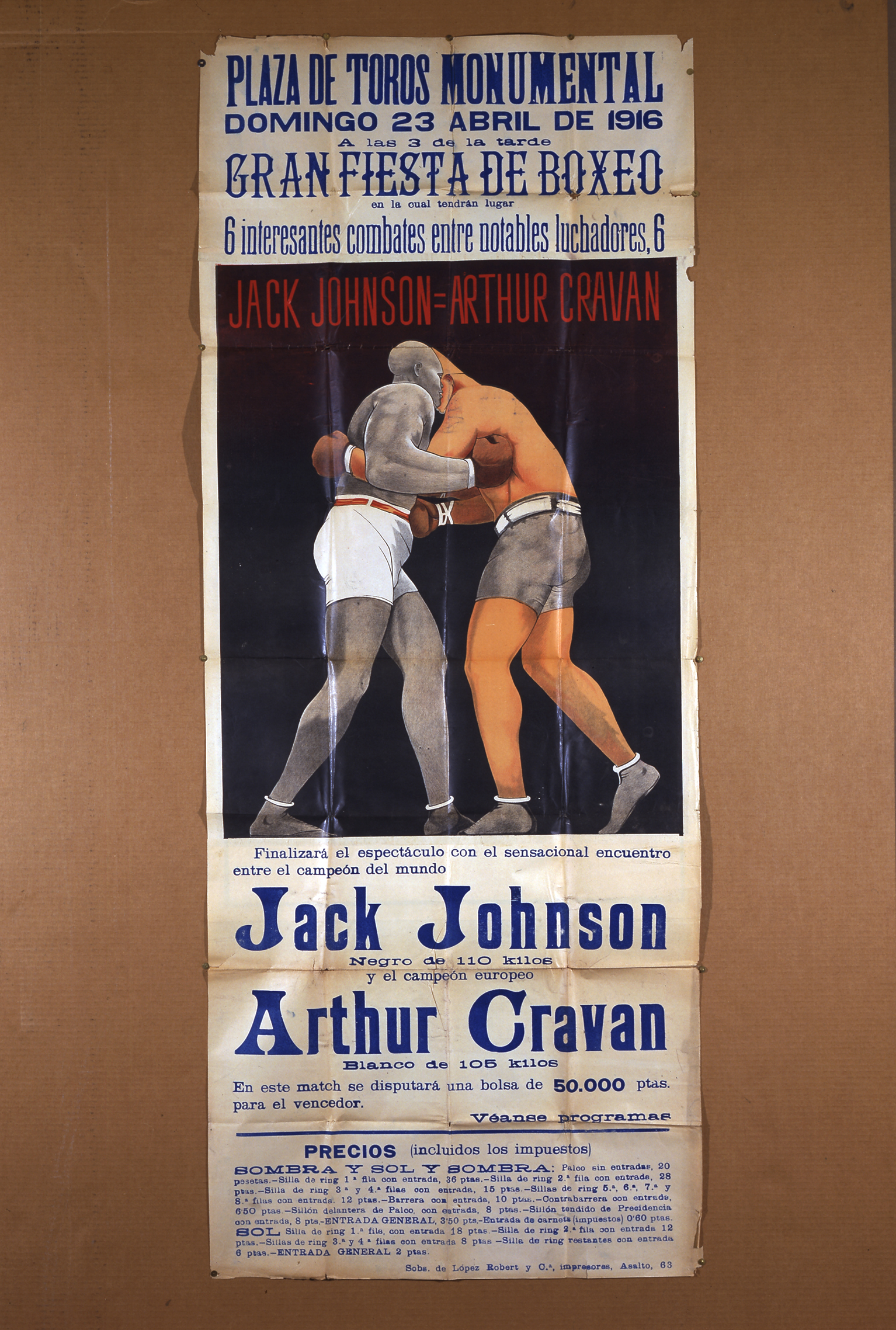 Uno de los carteles que anunciaba el combate de boxeo entre el ex campeón del mundo Jack Johnson y Arthur Cravan, el poeta-boxeador, se ha convertido en una imagen icónica de 1916. Cravan, que llegó a Barcelona huyendo de la guerra de 1914, se asentó en la ciudad junto a otros artistas e intelectuales europeos protagonistas de lo más avanzado en arte moderno. El combate, celebrado en la plaza de toros Monumental el 23 de abril de 1916, en una Barcelona cosmopolita, venía precedido de una campaña de publicidad. A pesar de todo, la afluencia de público fue escasa y el poeta-boxeador terminó tendido en la lona después de seis asaltos. Cravan, en su actitud habitual, no parecía dar importancia a la derrota: era un espectáculo por el cual cobraba y así vivía, para él era un juego. La provocación considerada como obra de arte.