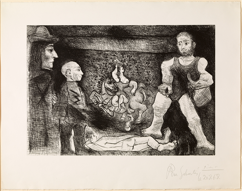 El interés que Picasso muestra por el boxeo es, de hecho, una proclamación de su gusto por el ocio popular, como también lo es su afición, bien conocida, por el circo, los cómics, el Wild West Show de Buffalo Bill o el cine, entre otros. Fernande Olivier, su compañera hasta 1912, lo confirma: «[A Picasso] le gustaba mucho el boxeo...»; y el propio pintor, con un tono que parece entusiasta, dirige esta frase a su marchante Daniel-Henry Kahnweiler: «El domingo por la tarde estuve en Aviñón, en el cinematógrafo, y pude ver la lucha de Carpentier-Klaus.» Los archivos personales de Picasso conservan también distintas entradas de combates de boxeo que demuestran la pasión del artista. Entre 1915 y 1916, el pintor es fotografiado con unos pantalones blancos, cortos y muy ceñidos, sin camisa, con los calcetines doblados sobre el tobillo, en el centro de su estudio de la calle Schoelcher y rodeado de sus pinturas. De pie, con los ojos clavados en el objetivo de la cámara, adopta una posición de luchador que anuncia la del púgil de su grabado Picasso, su obra y su público, del 16 de marzo de 1968. El combate de boxeo, que combina lucha, espectáculo, fuerza y valentía, es como una metáfora de la creación.