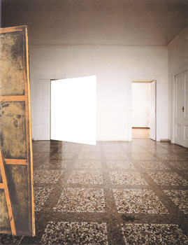 Here, as in other works, Paolini strips the space bare to make way for the light, the perspective and the space itself. All of the elements disappear except the canvas, which, as in Las Meninas, has its back to the viewer and opens up multiple perspectives that extend to infinity through the open door. Even the artist has disappeared. The mirror has here become an empty space; the reflection has vanished as if it had been cut out of the picture. The title, Fuori l’autore, thus has a double meaning: on the one hand it refers to this disappearance of the author, and on the other is a nod to the traditions of Italian theatre. (After a successful premiere it is customary to call for the author of the play to come on stage with the cry of ‘Fuori l’autore!’).