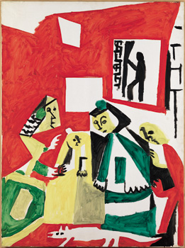 At the back of the room, the palace chamberlain, José Nieto, is barely suggested by a small black shadow in discord with the more joyful polychrome of the other personages. Picasso, like other contemporary artists, homed in on the figure of the chamberlain, whose elbow marks the ‘vanishing point’ of the Velázquez picture.