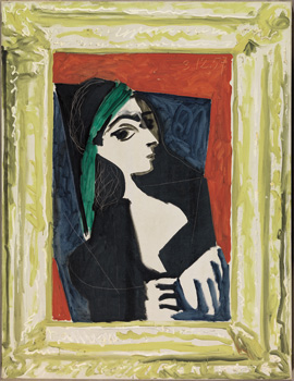 Like Philip IV and Queen Mariana, who were in the habit of watching Velázquez as he worked, Jacqueline used to visit Picasso on the upper floor of the house they shared. Velázquez immortalized one of those visits in Las Meninas, in a scene in which time seems to have been stopped by the entrance of the king and queen, who are reflected in the mirror at the back of the room. Picasso, in his very free paraphrase, surrounded this portrait of Jacqueline with a painted frame, as if it were the frame of a mirror.