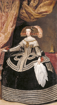 In this portrait, the only one that Velázquez painted in this large format, the queen wears an elegant dress in black and silver, with red details at the wrists and in the bows and feathers of her wig. The portrait shows a great contrast between the rigidity of the pose and the serious and impassive expression of the model and the technical virtuosity with which it is painted, with a loose, spontaneous brushstroke and great economy of means, but very controlled.