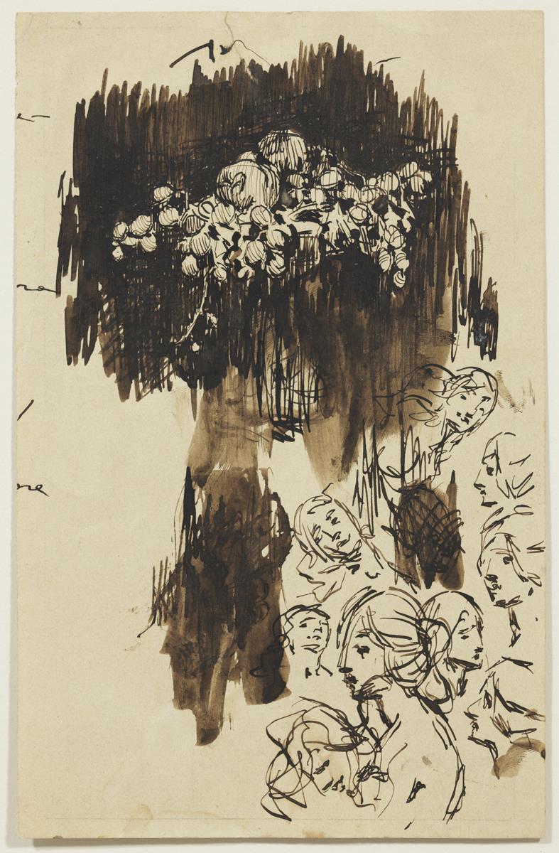Natura morta amb raïm i pomes, i nou croquis de caps femenins
