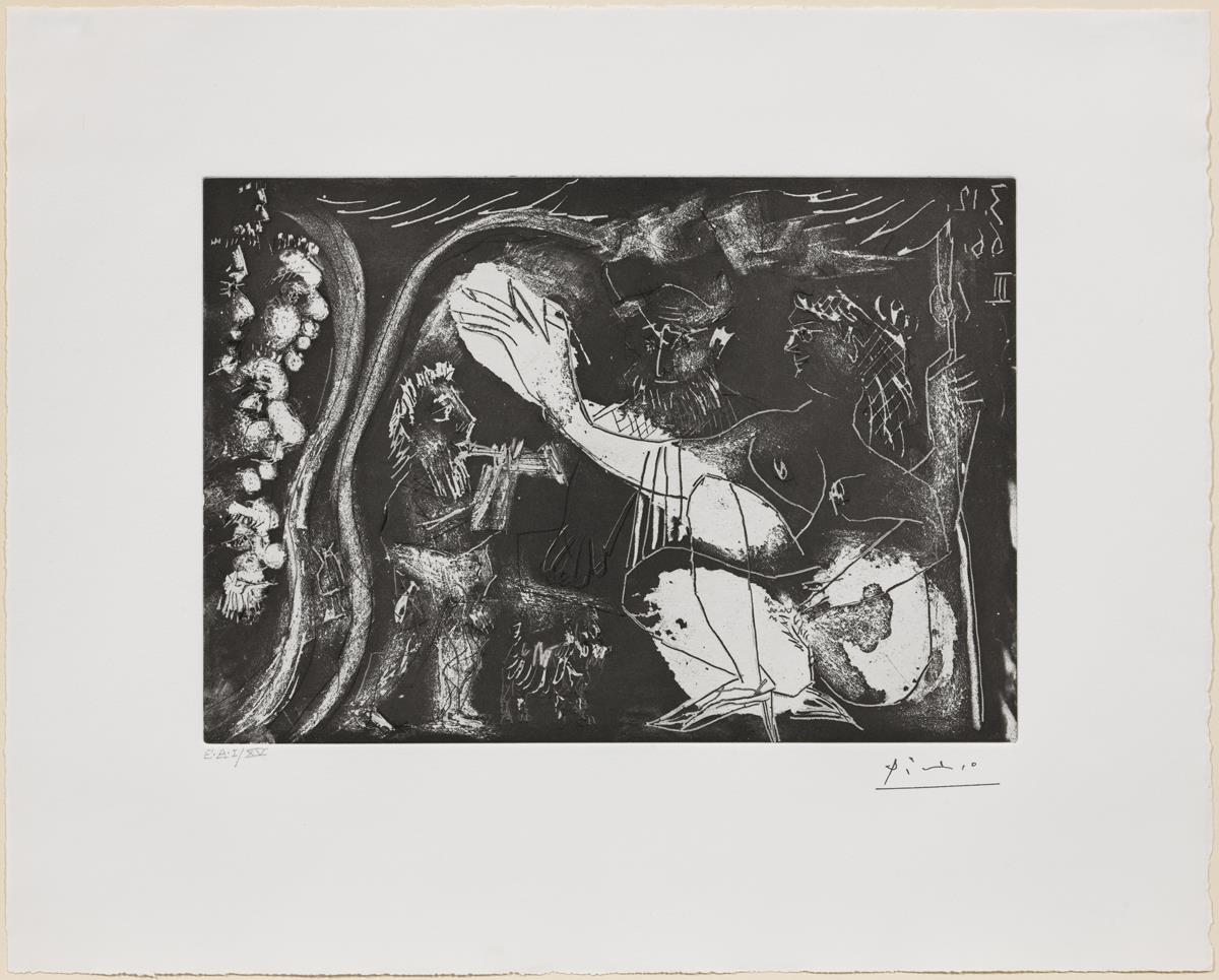 Aiguatinta (raspador, llàpis litogràfic i vernís líquid en el granejat abans de la mossegada), aiguafort i punta seca sobre coure; estampat sobre paper vitel·la Rives (prova d'artista numerada)