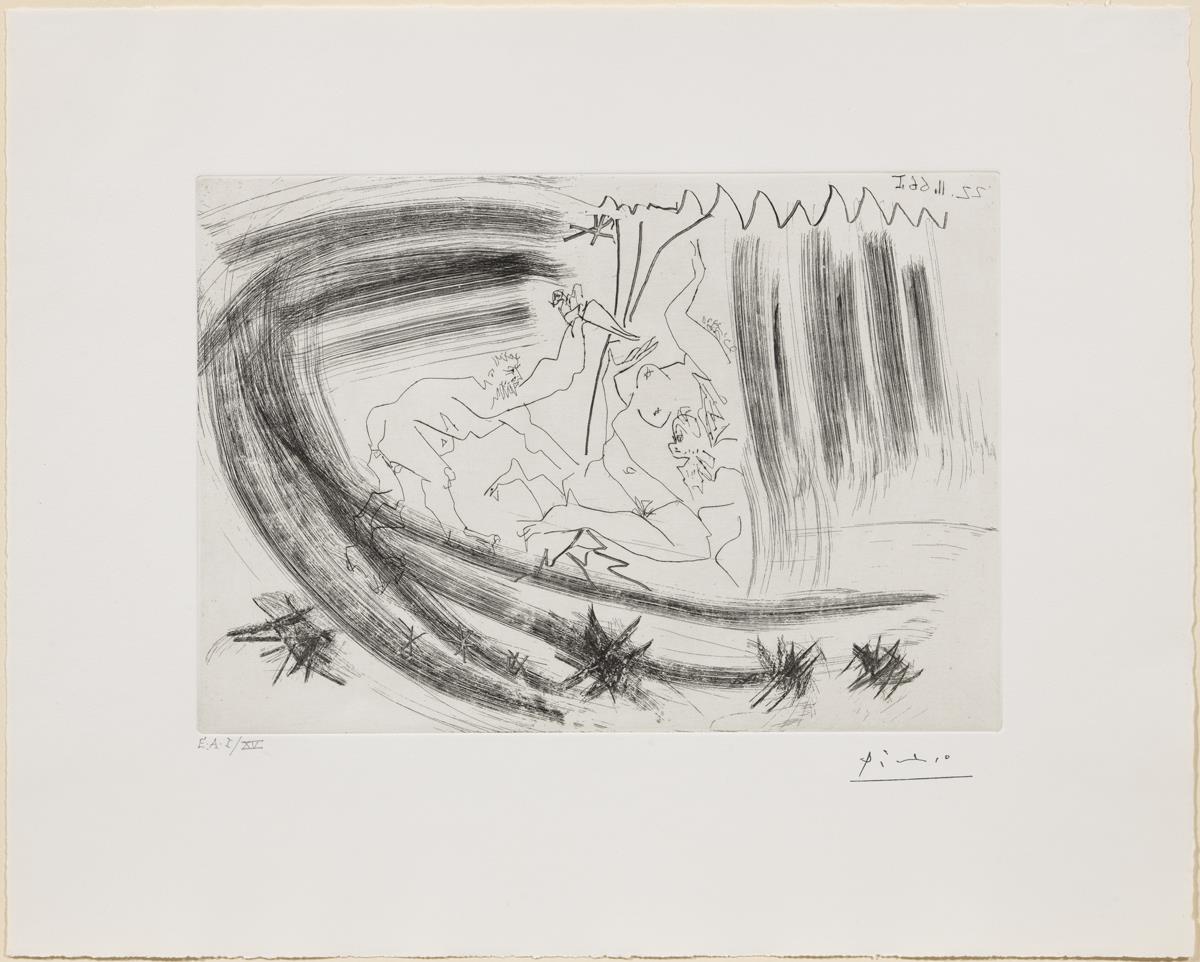 Aiguafort (en alguns llocs la punta enceta directament la planxa donant l'efecte de punta seca) sobre coure; estampat sobre paper vitel·la Rives (prova d'artista numerada)