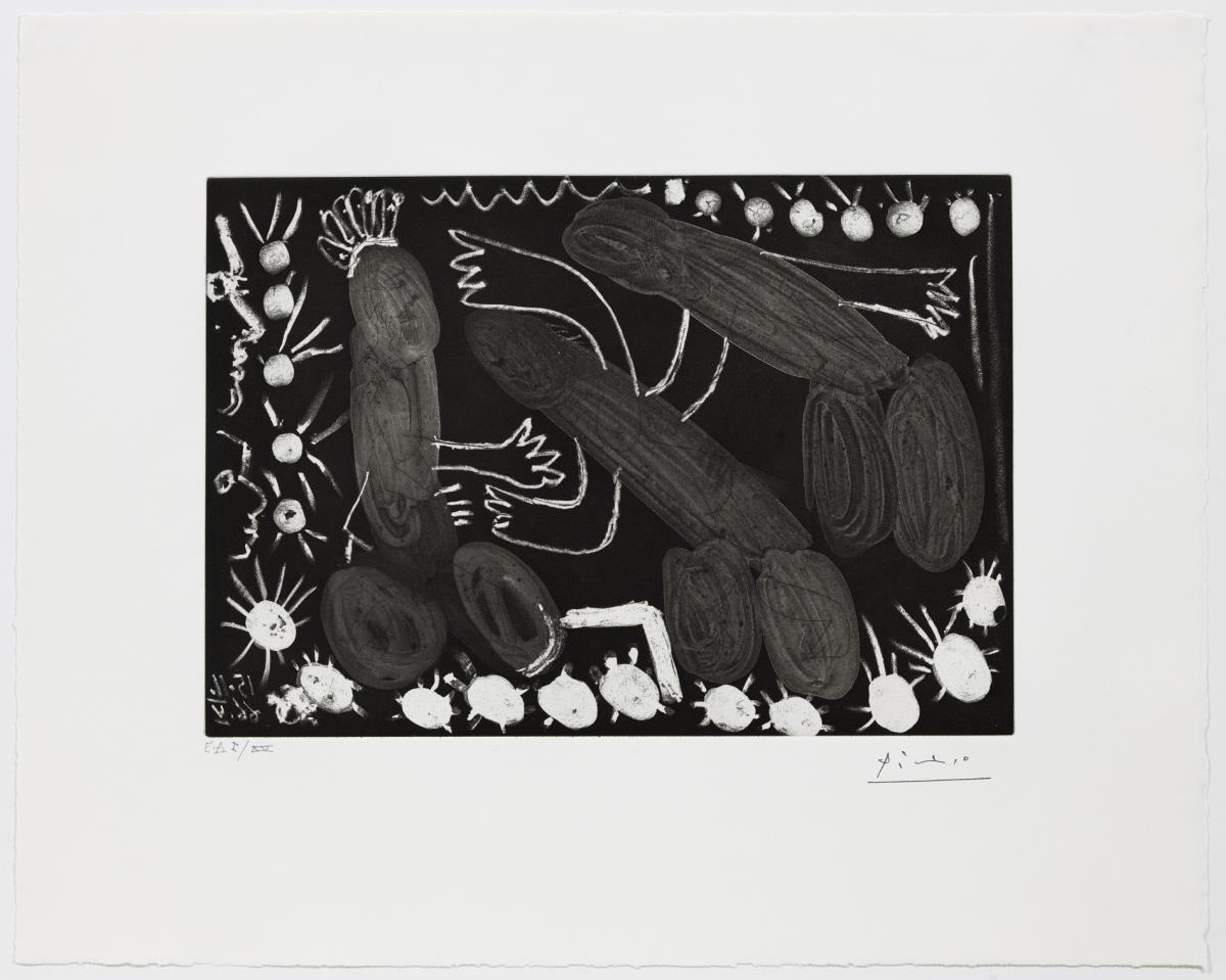 Aiguatinta (reserves al vernís líquid i al llapis litogràfic en el granejat) i aiguafort sobre coure; estampat sobre paper vitel·la Rives (prova d'artista numerada)