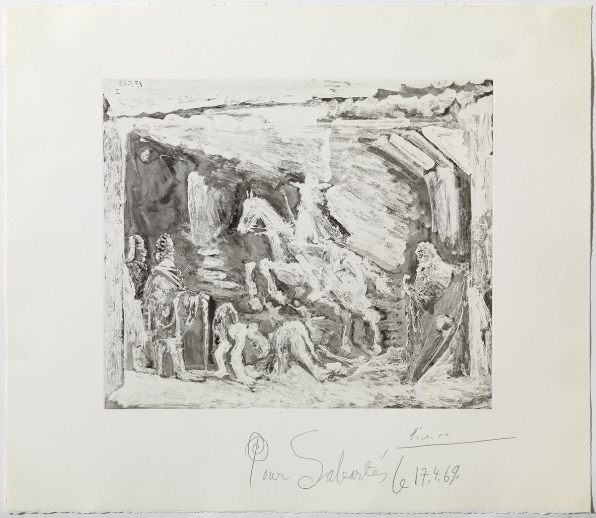Aiguatinta (reserves al vernís i al vernís diluït en el granejat) sobre coure; estampat sobre paper vitel·la Rives (prova Sabartés)