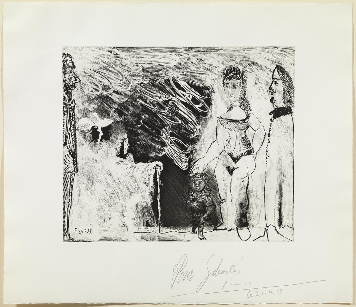 Aiguatinta, punta seca i raspador sobre coure; estampat sobre paper vitel·la Rives (prova Sabartés, II estat i definitiu)