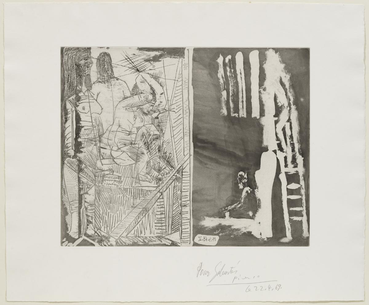 Aiguatinta (reserves al vernís i mossegada a la mà en el granejat) i aiguafort (en alguns llocs la punta enceta directament la planxa) sobre coure; estampat sobre paper vitel·la Rives (prova Sabartés)