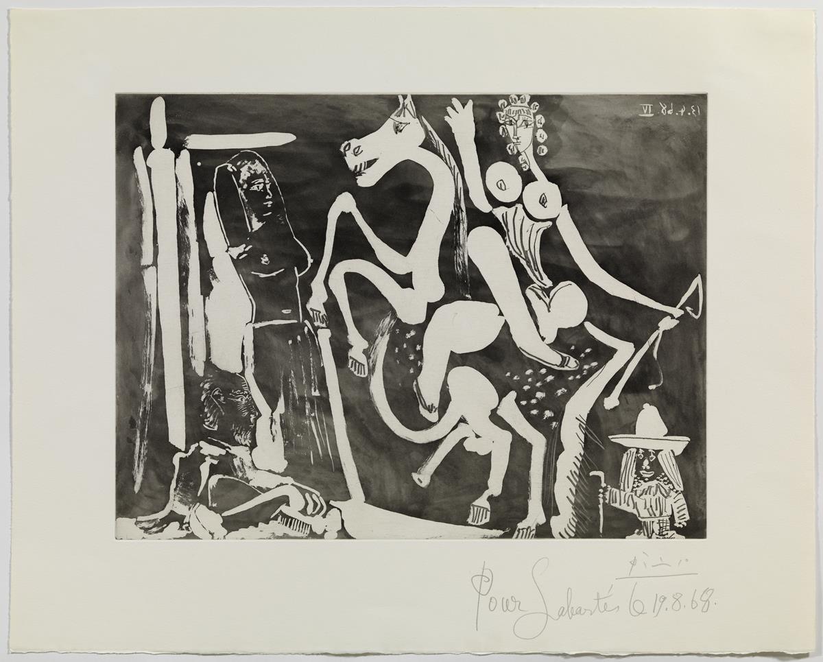 Aiguatinta (reserves al vernís i mossegada a la mà en el granejat) i aiguafort sobre coure; estampat sobre paper vitel·la Rives (prova Sabartés)
